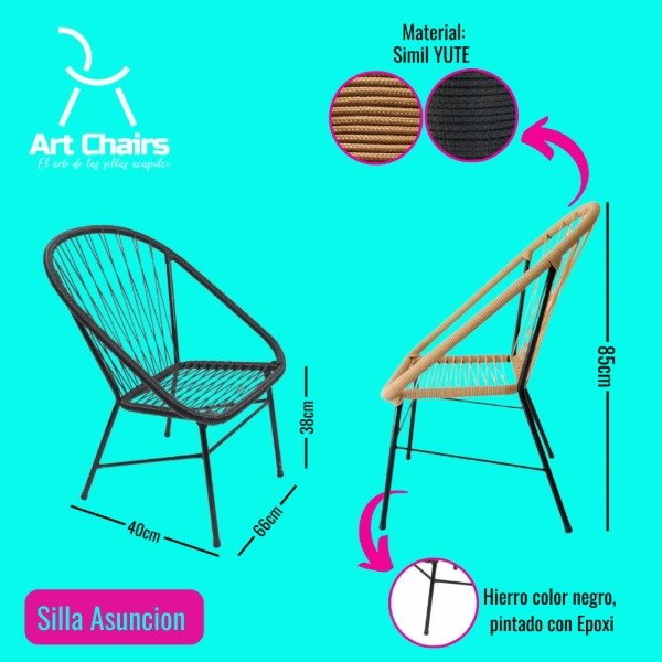 Su estructura es de hierro reforzado y viene en color negro o blanco. Puede elegir el tejido de soga símil yute en todos los colores.